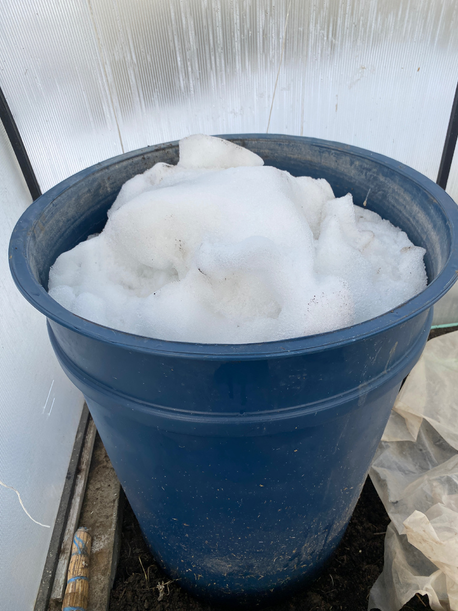 Поставила бочку, наполнила ее снегом. Растает и будет у меня вода на полив рассады.