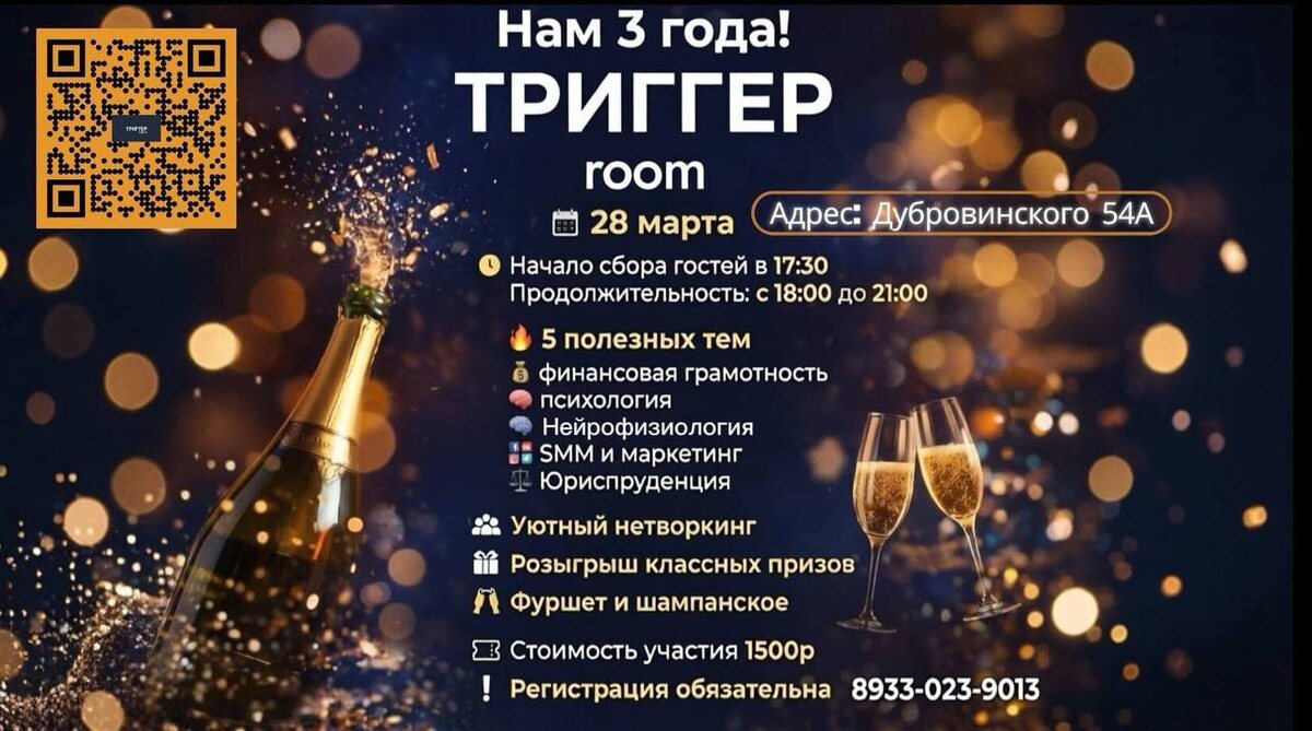 ! 28 марта ”ТРИГГЕР room”, где я веду очный прием, отмечает день рождения. Всех гостей вечера ждет 5 классных лекций по темам: — Финансовая грамотность — Психология (это я 😉) — Нейропсихология — SMM и маркетинг — Юриспруденция А ещё — уютный нетворкинг, фуршет, шампанское и розыгрыш призов! 🎁 В финале можно будет обменяться контактами. Визитки и подарочные сертификаты передавайте администратору на входе. 💸 Участие: 1500 руб. 📲 Обязательная запись у Анастасии: 8933‑023‑9013 (звонки / Telegram).
