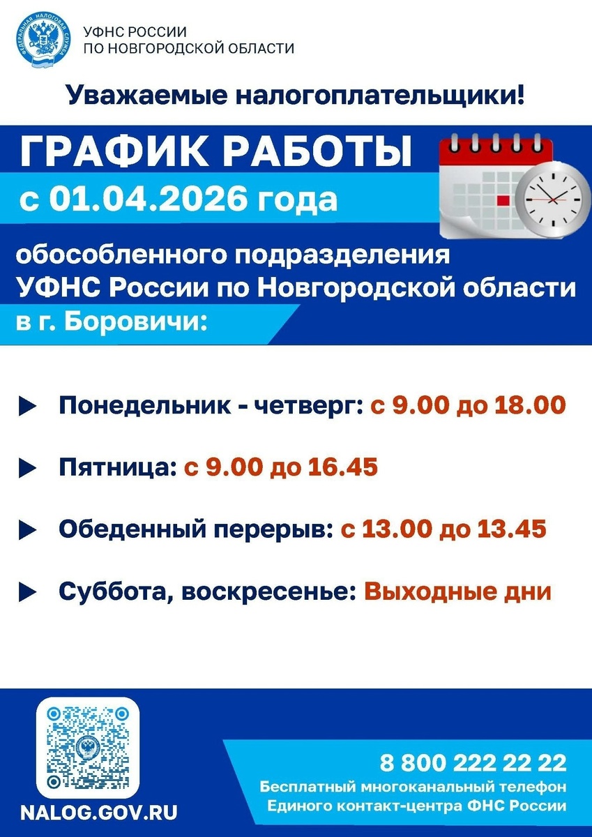С 1 апреля 2026 года меняется график работы обособленного подразделения УФНС России по Новгородской области в г. Боровичи☝️