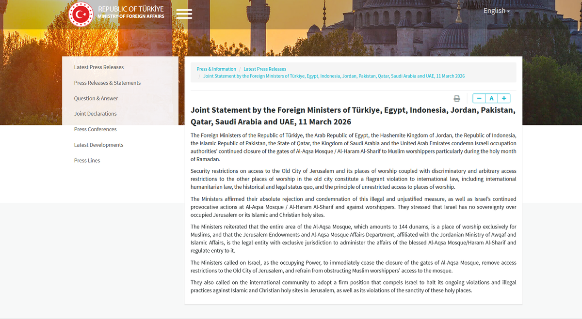 Исламской Республики Пакистан, Государства Катар, Королевства Саудовская Аравия и Объединенных Арабских Эмиратов осуждают продолжающееся закрытие израильскими оккупационными властями ворот мечети Аль-Акса / Al-Haram Al-Sharif для мусульманских верующих, особенно в священный месяц Рамадан.
