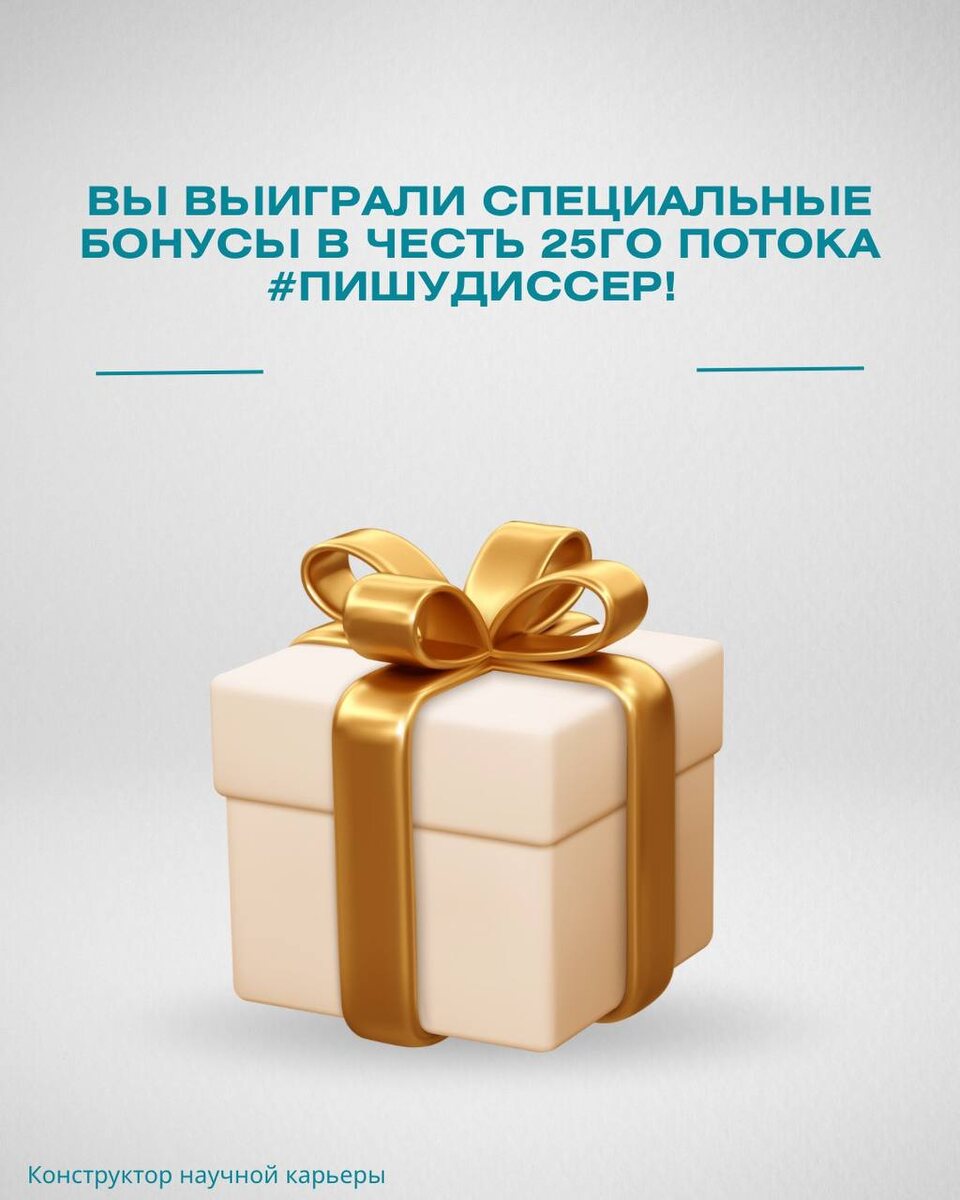 В понедельник мы открываем 25-й поток программы #ПишуДиссер. Важная дата — хороший повод поблагодарить вас за доверие и поддержку. На этой неделе мы провели закрытый вебинар для участников курса, на котором разобрали, как уйти от диссертационного хаоса и построить логичную систему при написании диссертации. Участники вебинара получили специальные бонусы. Мы подумали и решили, что в честь 25-го потока надо дать бонусы большему количеству читателей! Случайным образом были выбраны адреса, которое тоже получат доступ к бонусам, даже если не были на вебинаре. 🎉🎉🎉 Если вы сейчас читаете этот текст, поздравляю, рандомайзер выбрал вас! 🎉🎉🎉 Теперь у вас есть: 🔥 Скидка 5 000 руб. на любой тариф