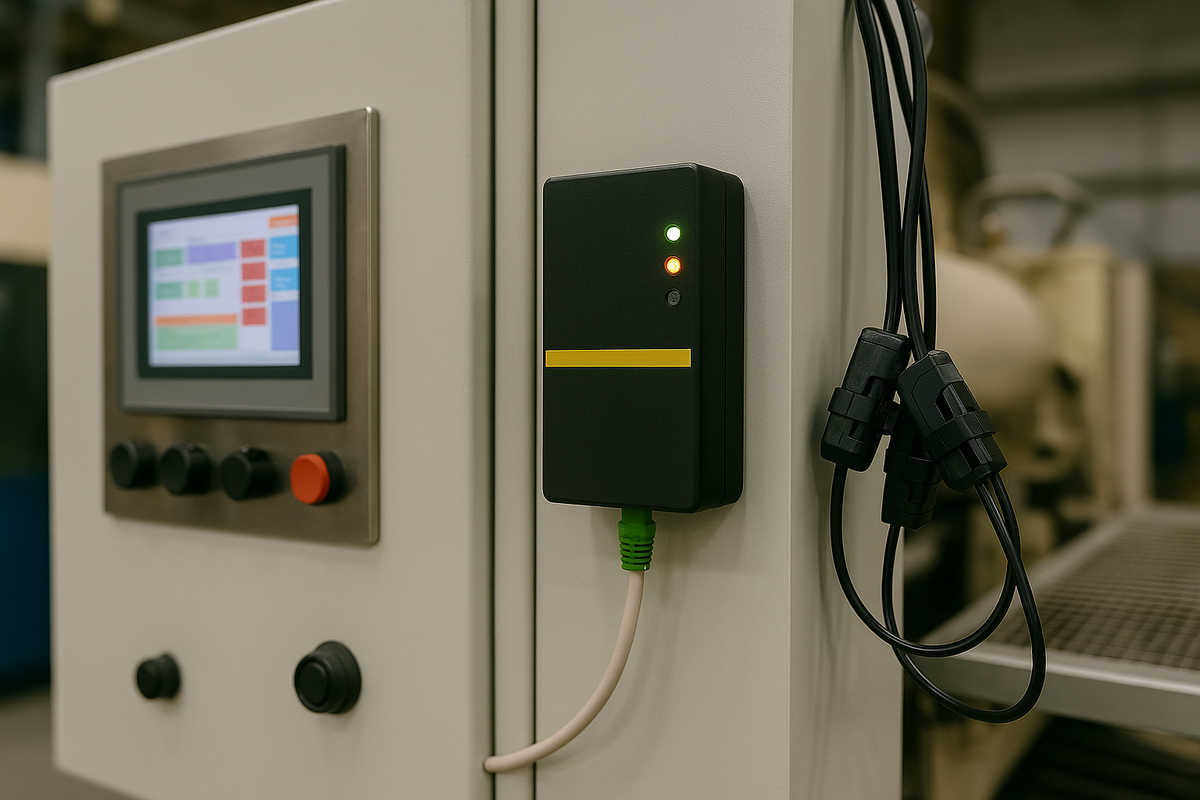 Система мониторинга станков ЭНКОСТ автоматизирует сбор данных о работе оборудования, фиксирует простои и их причины, уведомляет ответственных сотрудников о критических событиях и проводит аналитику всех показателей в режиме реального времени. В этом материале расскажем об аппаратной части системы — о “железе”, которое устанавливается на станки при внедрении ЭНКОСТ. Основным источником объективной информации является АПК «ПАУК» — IoT-устройство, которое монтируется внутри станка или в питающем его электрощите. На силовые провода устанавливаются токовые клещи (трансформаторы тока). Для монтажа не требуется отключать питание — клещи защёлкиваются поверх изоляции, не вмешиваясь в электрическую схему.