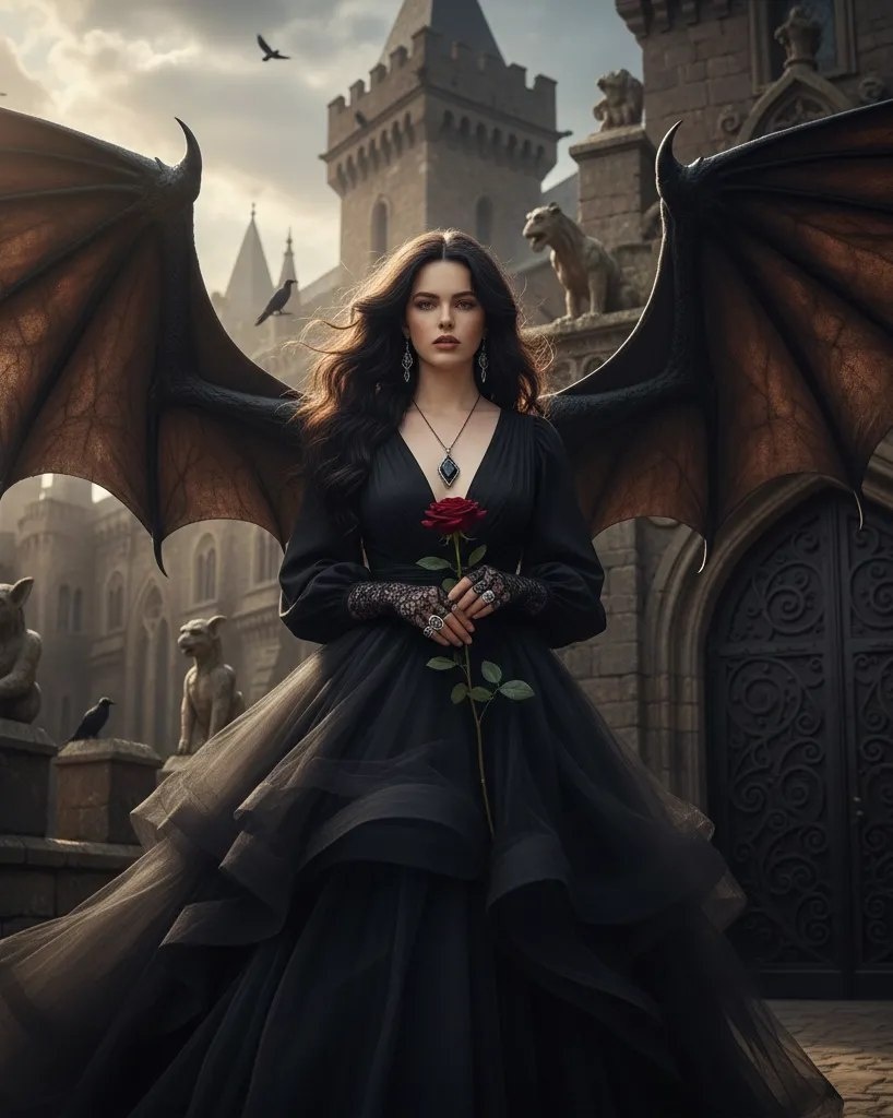 Загрузи свое фото и получи такое же изображение, на котором будешь ты. ✨ Создать фото через сайт ✨ ✨ Создать фото в телеграм боте ✨ Промпт: Создай реалистичный кадр. Соблюдай пропорции тела. Женщина стоит в полный рост на фоне готического замка Гарибальди. На заднем плане видны статую горгулии и химеры. Кованная дверь. Одежда: платье угольной чёрного цвета, v образный вырез, длинные свободные рукава. Низ из Фатина, юбка многослойная, с мягкими складками, создающими эффект летящего платья. На руках ажурные чёрные перчатки. Подбери украшения под написанный образ. Волосы: очень длинные, мягкие, крупные локоны, пробор на одну сторону. Волосы разлетаются на ветру. Изящная поза женщины, в руках бордовая Роза на длинном... Все промты для ИИ на нашем сайте и в телеграм канале #замок #вампир #демон #эпичное #готика #розы #цветы #женщина #фэнтези