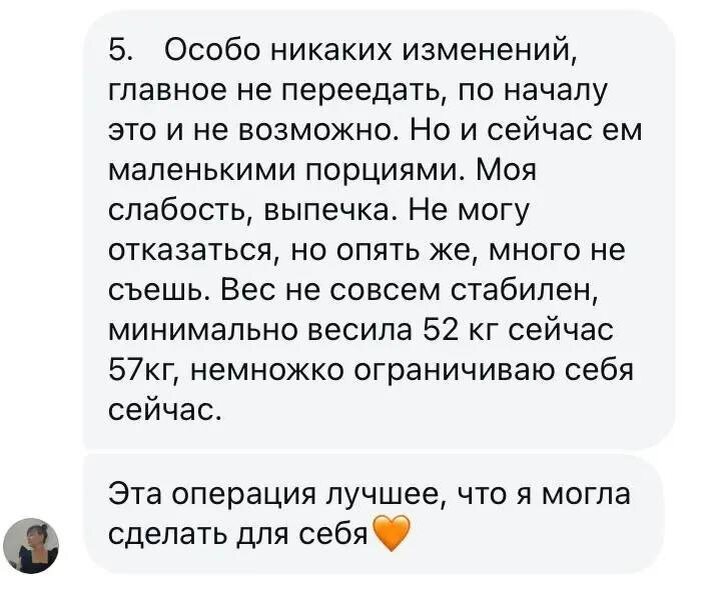? У многих возникает вопрос на начальных этапах: что происходит с организмом после операции? Этот пост для тех, кто уже проходит путь или только начал. После операции организм постепенно перестраивается: 1️⃣ Вес стабилизируется Первые месяцы снижение веса идёт активно, затем процесс замедляется. Организм адаптируется к новому объёму желудка и новому режиму питания. 2️⃣ Гормональный фон меняется Снижается уровень грелина, гормона голода. Чувство постоянного голода уменьшается, становится проще контролировать аппетит. 3️⃣ Возвращается энергия Появляется лёгкость в движении, повышается выносливость, привычные дела даются проще. 4️⃣ Формируются новые привычки Питание становится более структурированным. Маленькие порции, регулярные приёмы пищи, внимание к качеству рациона. Постепенно снижается привычка заедать эмоции, меняется отношение к еде. 5️⃣ Меняется самочувствие и восприятие себя Появляется уверенность, больше энергии и желания двигаться. Улучшается общее качество жизни. Бариатри