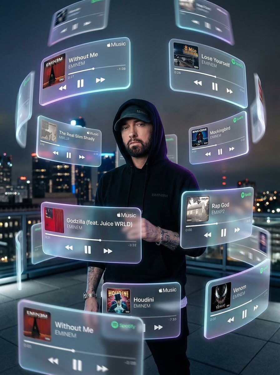 Инструкция: Для этого заходим в VeoSeeBot или на сайт, выбираем "Работа с изображениями", выбираем Nano Banana Pro и пишем промпт ниже: [EMINEM]: Введите здесь имя музыкального исполнителя. Цель: Создать кинематографичный, сказочный визуальный образ в дополненной реальности с [EMINEM] в качестве центрального персонажа, окруженного системой плавающих по орбите карточек с музыкальным интерфейсом. 1. ТЕМА и ДИНАМИЧЕСКИЙ ТРЕК-ЛИСТ - Персонаж: высококачественный, реалистичный портрет [EMINEM] в качестве центральной фигуры. - АВТОМАТИЗАЦИЯ с помощью искусственного интеллекта (КРИТИЧНО): На основе имени, указанного в [EMINEM], определите 8 самых популярных песен. Автоматически замените приведенный ниже список заполнителей на настоящие названия песен. - Рекомендуемые треки: [Заполнители для таких песен, как century, rottweiler, 4 raws, phantom, mist, cali man, LV sandals]. Название каждой песни должно отображаться на отдельной плавающей карточке с 3D-интерфейсом. 2. AR ИНТЕРФЕЙС и карточки
