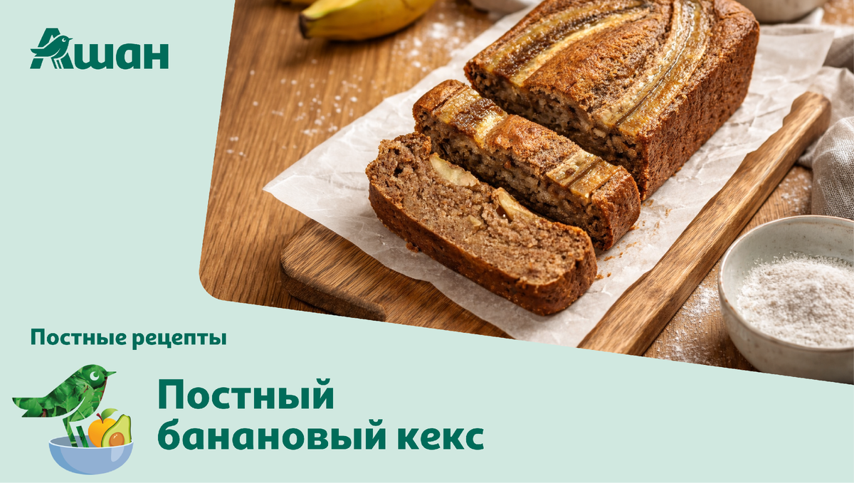 Такая выпечка точно станет одной из самых любимых на вашем столе в пост. Ароматные бананы в сочетании с корицей создают идеальный дуэт вкусовых оттенков в воздушном кексе без яиц. Подойдет для любого случая! Ингредиенты: Готовим! Шаг 1. Измельчите семена льна в кофемолке. Добавьте к ним 3 столовые ложки кипятка и дайте настояться 15 минут — эта масса заменит яйца в рецепте. Шаг 2. Разомните бананы вилкой до состояния однородного пюре. Шаг 3. Добавьте к банановому пюре настоявшуюся льняную массу, влейте миндальное или овсяное молоко, растопленное кокосовое масло, тростниковый сахар, корицу и щепотку соли. Перемешайте, а затем всыпьте пшеничную муку, разрыхлитель и соду, погашенную яблочным уксусом. Шаг 4. Разогрейте духовку до 180 градусов. Застелите форму для выпечки пергаментной бумагой. Вылейте тесто в форму, разровняйте поверхность и, по желанию, украсьте сверху разрезанным пополам бананом. Шаг 5. Выпекайте кекс 30–40 минут. Проверьте готовность деревянной шпажкой или зубочисткой —