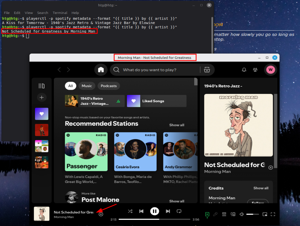 Прежде чем двигаться дальше, проверьте — корректно ли Playerctl получает информацию от Spotify. Запустите Spotify, включите любой трек, после чего выполните эту команду. Если всё работает правильно, Playerctl сразу выдаст название песни и исполнителя.