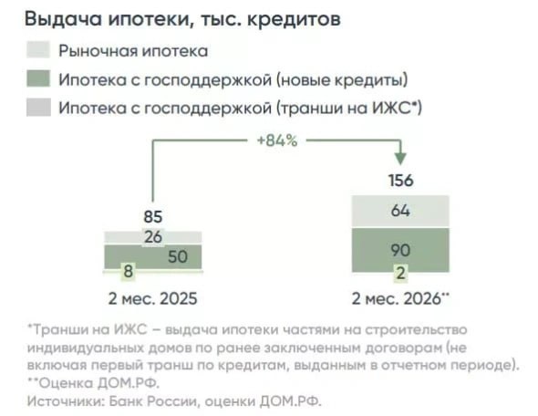 ! Пока инвесторы продолжают концентрироваться на нефтянке, сегмент девелоперов остается вне поля зрения – хотя именно здесь начинает формироваться одна из самых интересных историй на фоне уже начавшегося смягчения денежно-кредитной политики. Продолжающееся снижение ставки постепенно разворачивает спрос на жилье, но сектор девелоперов рынок пока явно недооценивает. 👉Ипотека оживает быстрее ожиданий Снижение ставки постепенно начинает транслироваться в восстановление спроса на жилье. И это уже видно в цифрах. По данным ДОМ.PФ, рынок ипотеки оживает быстрее ожиданий – за январь-февраль 2026 статистика выдачи следующая: ▪️льготная ипотека: 90 тыс. кредитов (+78% г/г) на 526 млрд рублей (+83% г/г) ▪️рыночная ипотека: 64 тыс. кредитов (+2,5х г/г) на 185 млрд рублей (+3,5х г/г) 👉Причем особенно важно – оживает именно рыночный сегмент. Только за февраль выдано 40 тыс. кредитов (+2,6х) на 108 млрд рублей (+3,5х). Это прямой сигнал: чувствительность спроса к ставке работает, и цикл разворот