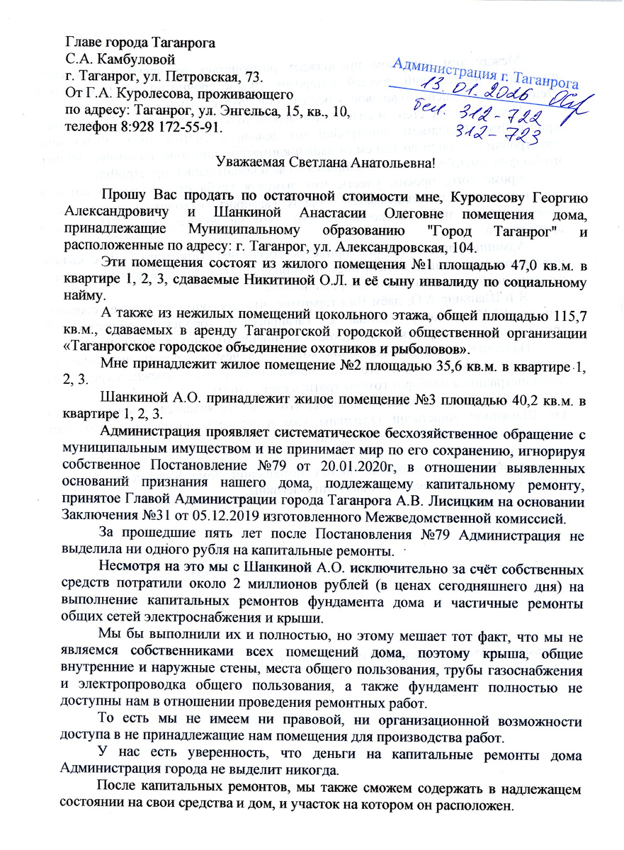 Поскольку для подачи судебного иска, нужно иметь документ от Администрации славного города Таганрог в отказе нашей просьбы, я передал 13 января 2026 года в канцелярию соответствующее письмо от нас на имя Главы города Камбуловой С.А. Уже 2 февраля 2026 года получил весьма витиеватый ответ от не Заместителя Главы города, а от Заместителя Главы Администрации города Таганрога по вопросам архитектуры, строительства и муниципальной собственности Александра Сергеевича Полянина. Теперь по поводу весьма любопытных мероприятий, проводимых областной прокуратурой в помещениях нашей городской Администрации. Оказалось мероприятия связанны с хищениями бюджетных денег, выделенных на посадку в славном городе Таганроге. Вспомнил наше с Настей взаимодействие с МУП Благоустройство и с Отделом по охране окружающей среды и природных ресурсов Администрации города Таганрога. А взаимодействие было очень бурным с начала августа 2022 года до середины января 2026 года. Взаимодействие касалось спила всего лишь 8-