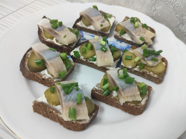 Соленая селедка приобретает новую, более мягкую и деликатную текстуру благодаря нежному яичному крему, а оливки добавляют пикантную солоноватость и яркий акцент.