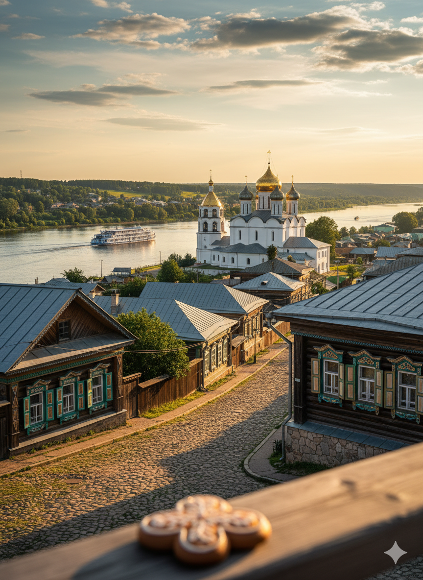 Вдоль набережной тянется живописная аллея с купеческими особняками XIX века, резными наличниками и небольшими сувенирными лавочками. Утром здесь почти безлюдно — можно неспешно пройтись, вдыхая речной воздух, прежде чем углубиться в музейный квартал.