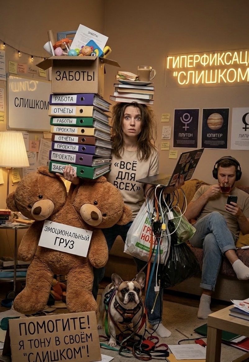 Однако настоящим спонсором гиперфиксации выступает Черная Луна, она же Лилит. Там, где в карте стоит фиктивная точка искажения, образуется слепое пятно. Лилит работает как оптическая иллюзия и воронка абсолютной ненасытности. Обладатель пораженного сектора чувствует постоянный, фантомный голод. Ему кажется, что он делает недостаточно. Если Лилит искажает зону заботы, натив превращается в удушающее шерстяное одеяло в сорокаградусную жару. Трагедия заключается в попытках наполнить ведро без дна: спасатель вливает в человека тонны элитного эмоционального топлива, надеясь наконец-то получить гарантии любви, а черная дыра лишь довольно урчит и требует новой порции жертвенности.