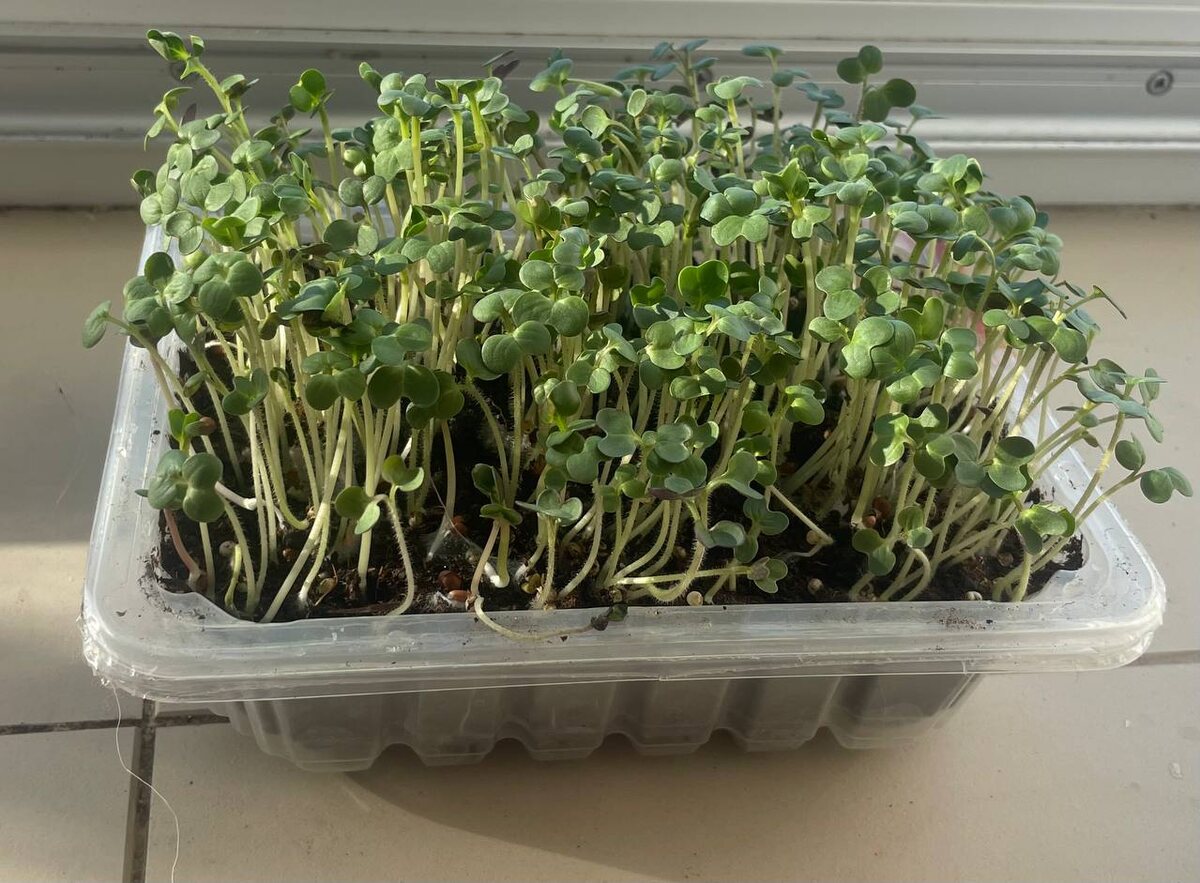 Эксперименты с сидератами подарили прекрасный бонус - вышедшая из эксперимента и срезанная зелень оказалась вполне себе съедобной с приятным вкусом рукколы. Решил посадить во вторник вечером просто так контейнер «на поесть». Понадобилось всего