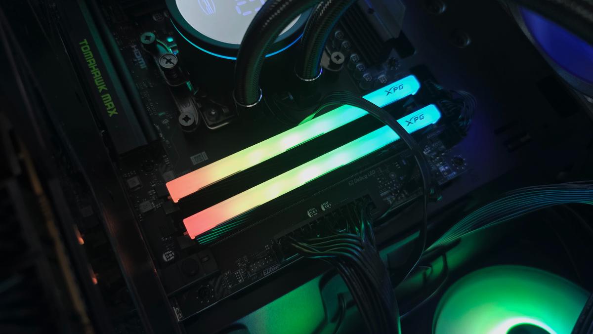 С внешним видом все сдержанно. Радиаторы черные. Есть рельефный рисунок из диагональных линий, который чуть меняется под разным углом света. Сверху идет длинный матовый рассеиватель, под ним расположена RGB-подсветка. Свет распределяется по длине модуля ровно, без явных провалов и пятен, хотя сами светодиоды стоят только с одной стороны платы. Управление стандартное: через софт материнской платы или через XPG Prime.