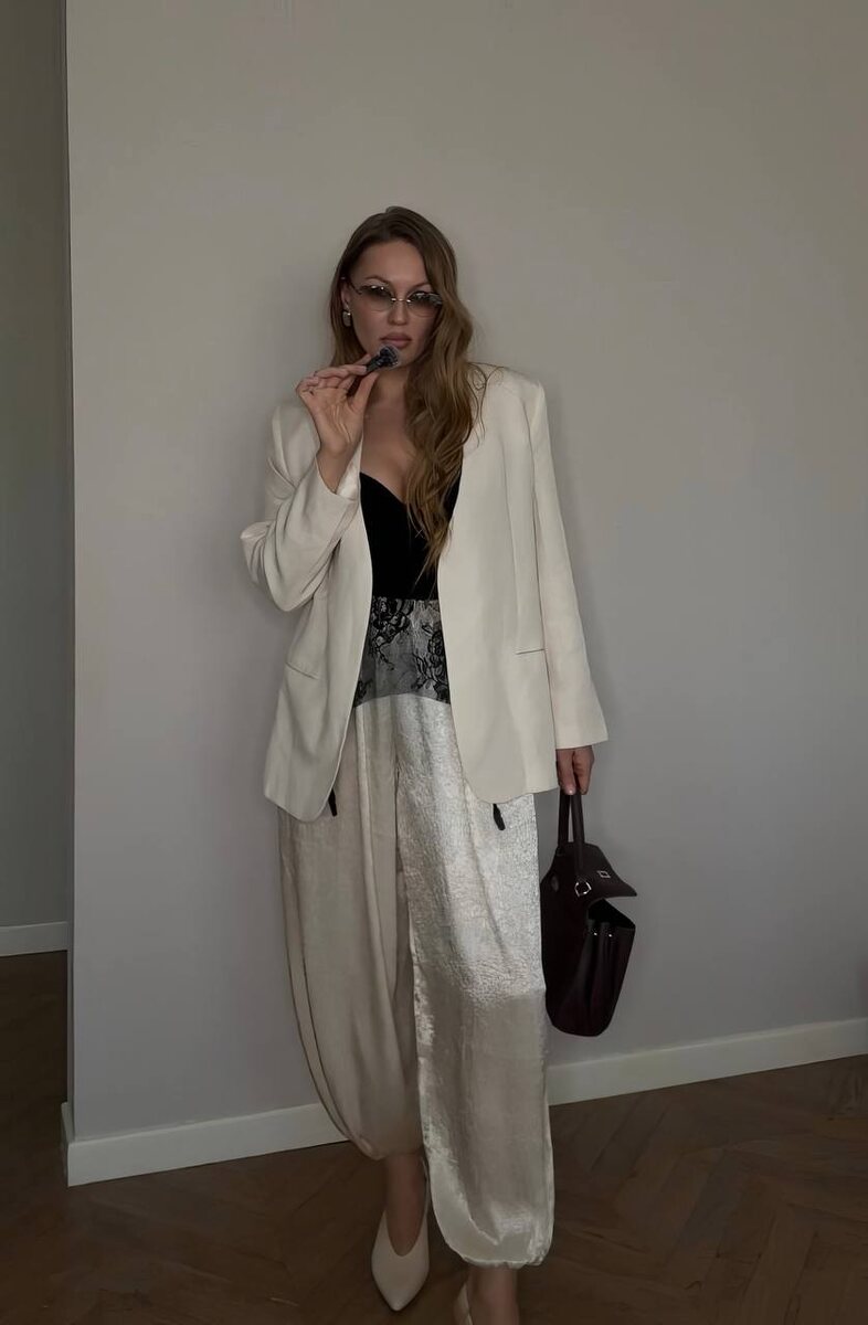 😎 А боди действительно утягивает, и качество понравилось Боди 1200 рублей Брюки 2600 рублей Жакет 11800 рублей Туфли 3700 рублей Пояс 1700 рублей Серьги 900 рублей Сумка 11600 рублей #моиобразы #вечерний #боди #пиджакижакеты #аксессуары #брюки