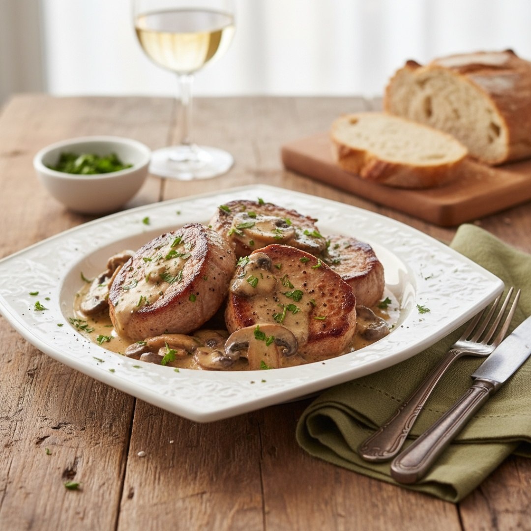 Ингредиенты⤵️ 🔸Свиная вырезка — 500 г 🔸Соль, перец —1 щепотка 🔸Масло растительное — 30 г 🔸Сливочное масло — 30 г 🔸Шампиньоны — 300 г 🔸Лук репчатый — 1 шт. 🔸Сливки 20% — 300 мл 🔸Чеснок — 2 зубчика 🔸Сыр твёрдый — 50 г 🔸Мука — 1 ст.л. 🔸Тимьян — 1 щепотка 🔸Зелень — 1 пучок Приготовление🥩 1. Нарезать вырезку медальонами, отбить, посолить, поперчить. 2. Обжарить на сильном огне с маслом по 2–3 минуты с каждой стороны. Добавить сливочное масло, обжарить ещё по минуте. Переложить в тарелку. 3. В той же сковороде обжарить лук до прозрачности, добавить грибы и жарить до выпаривания жидкости. 4. Добавить чеснок и муку, готовить 1 минуту. 5. Влить сливки, добавить тимьян, соль, перец. Довести до кипения, варить 3–5 минут до загустения. По желанию добавить сыр. 6. Вернуть медальоны в соус, прогреть 2–3 минуты. Рецепт дня #медальоны #свиная_вырезка #мясо #свинина #соус #сливочный_соус #грибы #ужин