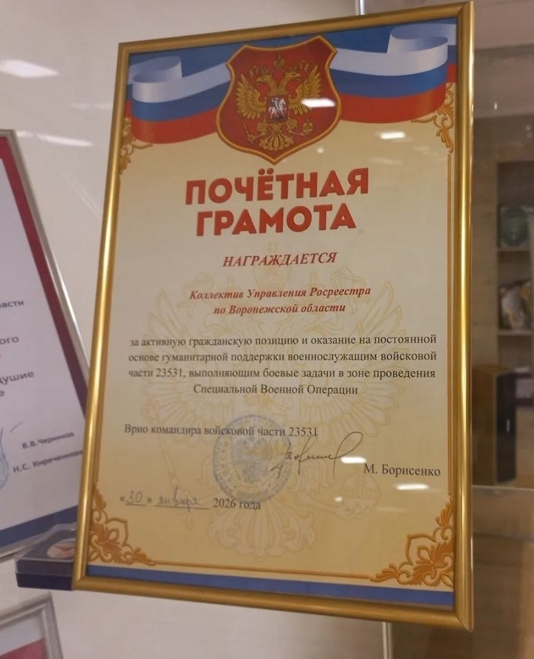 Управление Росреестра по Воронежской области получило высокую оценку своей волонтерской деятельности. В адрес коллектива поступила почетная грамота от врио командира войсковой части 23531. Военнослужащие выразили признательность специалистам службы за активную гражданскую позицию и систематическую поддержку бойцов, выполняющих задачи в зоне проведения специальной военной операции.