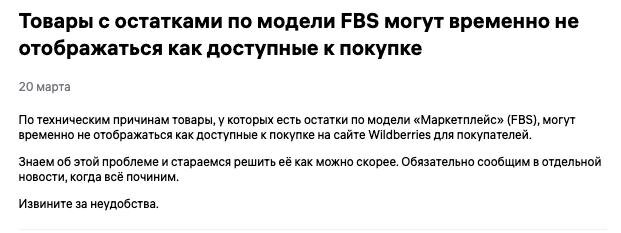 Признали не сразу, но признали Товары по FBS временно не отображаются как доступные к покупке. WB это подтвердил официально. Интересно другое. Пока не появились публикации в федеральных СМИ, продавцам отвечали в стиле: «отключите VPN», «почистите куки» После — уже «знаем о проблеме, решаем». Сроки, как обычно, без конкретики. И классическая асимметрия: если селлер не вовремя привёз товар — штраф если площадка не показывает товар — «извините за неудобства» Но ладно, хотя бы признали. Уже прогресс. Если у вас плохо прогружаются файлы, все посты также доступны в MAX: https://max.ru/marketplace_biz