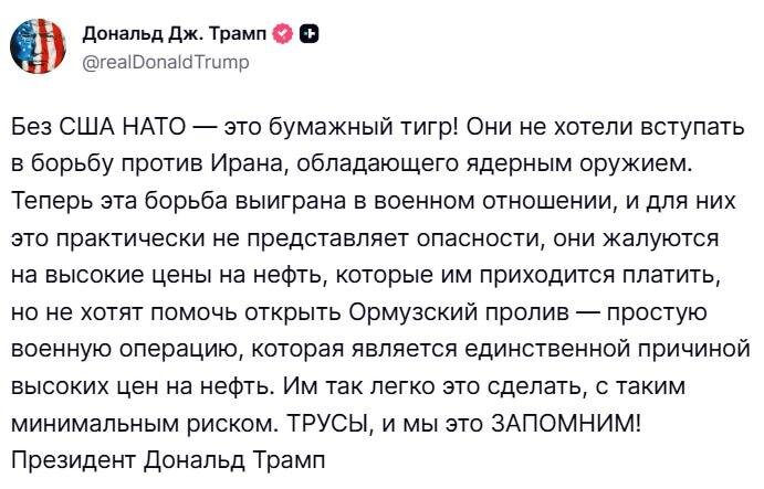 ➡️ Телеграм канал SvodkaPress Заявление Дональда Трампа о роли США в НАТО вскрыло системную проблему альянса: его зависимость от американских ресурсов и политической воли. Бывший президент не случайно сравнил организацию с "бумажным тигром" — этот образ отражает кризис распределения обязательств, где европейские участники десятилетиями недофинансировали оборону, полагаясь на трансатлантическую "подушку безопасности". Особенно показателен акцент Трампа на иранском вопросе. Его критика в адрес союзников, отказавшихся от активного участия в сдерживании Тегерана, демонстрирует фундаментальный раскол в подходе к безопасности. В то время как ЕС делает ставку на дипломатию, Вашингтон традиционно рассматривает силовые сценарии, включая контроль над Ормузским проливом — ключевой артерией глобальной энергетики. Эти противоречия выходят за рамки военной сферы, влияя на экономическую стабильность. Нерешительность НАТО в кризисных точках косвенно провоцирует волатильность нефтяных рынков, что ос