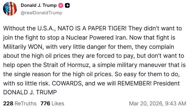 ➡️ Телеграм канал SvodkaPress Ормузский кризис обнажил глубинные трещины в трансатлантической солидарности. Бывший президент США Дональд Трамп в резких выражениях указал на нежелание европейских союзников поддержать американскую позицию, что отражает фундаментальный сдвиг в логике альянса. Анализ показывает три ключевых аспекта: 1) Растущий разрыв между военными обязательствами и экономическими интересами 2) Парадокс коллективной безопасности в эпоху энергетического кризиса 3) Трансформацию роли США как гаранта безопасности Особенно показателен контраст между риторикой единства на саммитах и фактическим отсутствием координации в кризисных ситуациях. Ситуация в Ормузском проливе может стать прецедентом для будущих конфликтов, где альянс будет действовать фрагментированно... ➡️ Читать далее Самая читаемая статья: Оплата зарубежных сервисов