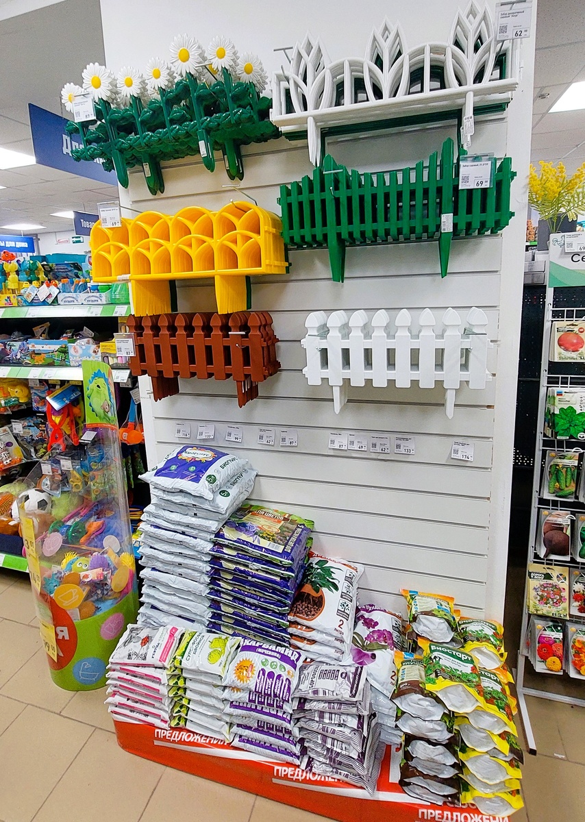 В отделе «Сад и огород» в Фикс Прайс внимание к себе привлекают милые пластиковые заборчики, отличный вариант для цветочных клумб. Цены от 62 рублей