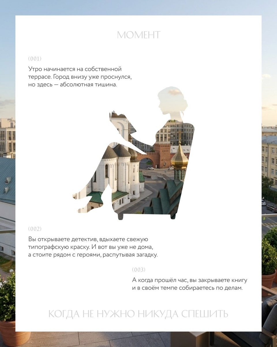 Мы часто отправляемся в музейные и галерейные залы, чтобы прикоснуться к прекрасному. Но величайшее искусство встречается не только там — оно кроется в умении замечать красоту деталей. Как художник пишет картину из сотен выверенных мазков, так и мы создаём своё уникальное произведение из мыслей, привычек и ритуалов. В продуманной среде даже незаметные детали собираются в галерею эстетичных сюжетов. А дома RBI органично встраиваются в этот ритм, превращая обычный день жителей в подлинный шедевр. В карточках мы собрали моменты одного дня: от первой утренней паузы до вечернего уединения. Листайте, чтобы погрузиться в атмосферу. А когда дочитаете, отмечайте реакцией: какой сценарий станет идеальным завершением вашего вечера? 😇 — посвятить время себе и замедлиться 😇 — раствориться в объятиях близких