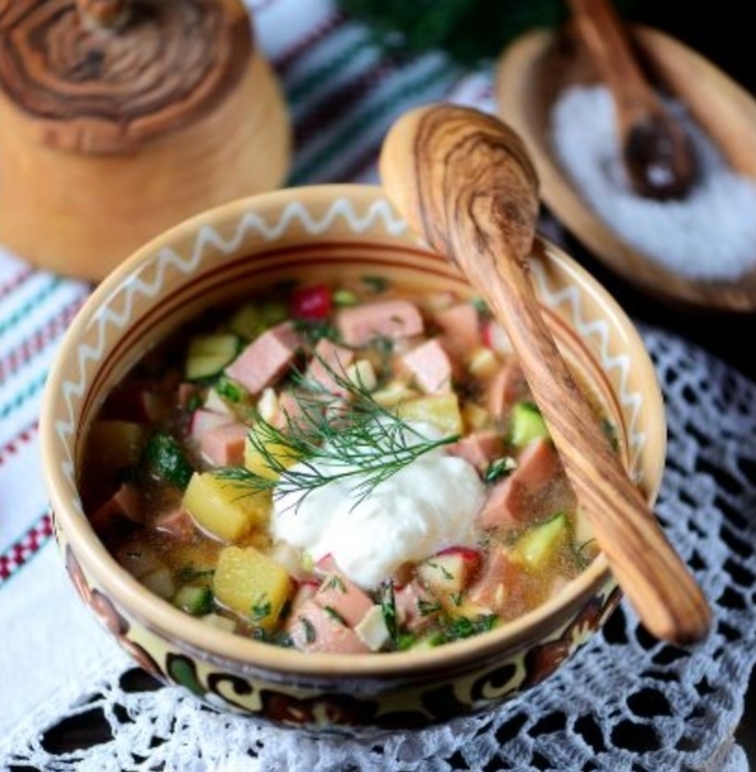 Холодный, освежающий, с горчинкой хрена и пряностью горчицы. Квас даёт сладость, сметана — нежность, овощи — хруст. Это не еда, это спасение в июльский полдень.