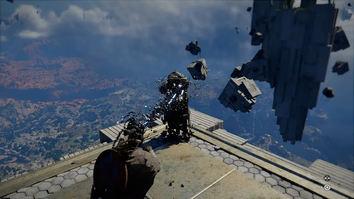 Многие головоломки здесь требуют вдумчивого подхода и самостоятельного изучения скрытых механик. Задание «Бездна без баланса» станет одной из первых серьезных проверок на сообразительность. Это первый квест, связанный с Бездной, который встретится на пути, и он до отказа набит новыми элементами управления. Эта миссия органично вплетена в сюжетную линию задания «Противоположности». После решения первой загадки на выравнивание и просмотра видеоролика герой окажется в новой локации перед треугольной аркой. Проход через Врата Небесного моста станет отправной точкой этого сюрреалистичного испытания. Врата Небесного моста Сразу после прохождения арки путь преградит устройство, напоминающее колонну. Здесь предстоит применить Силу Аксиомы. Наведите камеру на колонну и нажмите L3 на геймпаде. Дождитесь, пока индикатор захвата не окажется точно по центру. Отпустите L3 и с помощью крестовины (D-Pad) вращайте терминал, пока не откроется проход. Если все сделано верно, терминал засветится синим цве