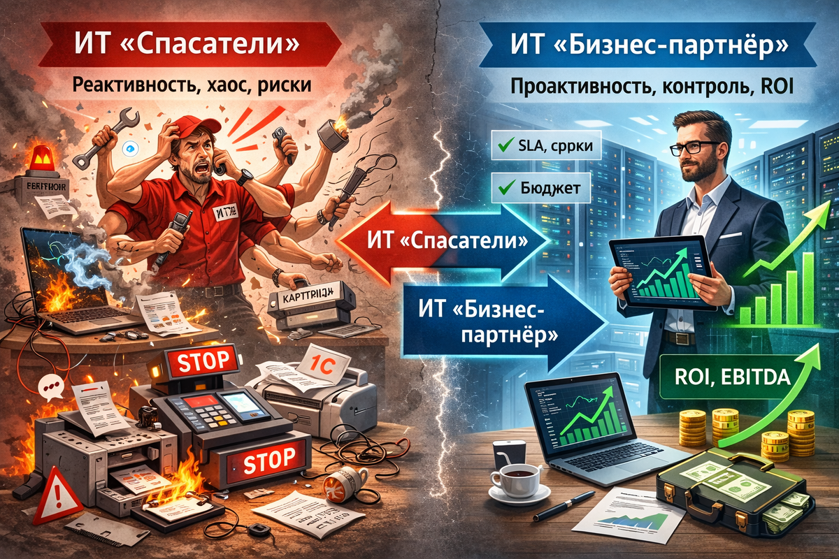 За более чем 20 лет я поработал с десятками компаний в разных странах с оборотом от 0,5 до 300+ млрд рублей - внутри бизнеса, как внешний эксперт, как представитель вендора и в рамках профессионального обмена опытом. В 85% компаний собственники и CEO задают одни и те же вопросы: Это не эмоции или поиск ответов. Это диагноз. Практически всё корпоративное ИТ можно разделить на два крайних типа (не относится к компаниям, где ИТ - зарабатывающее подразделение). И это разделение не зависит ни от размера бизнеса, ни от масштаба ИТ-департамента. Ключевое слово - реактивность. Произошла проблема - вы выслушали рассказ, почему она случилась. Чтобы её исправить, требуется дополнительное управленческое вмешательство. Это рабочая модель. Прежде всего потому, что она дешевая. Стоимость ИТ-специалиста ниже рынка - как и уровень его компетенций. Задачи никуда не исчезают. Их решают другие сотрудники - сами заказывают картриджи, вызывают мастеров «на час», покупают оборудование через аванс. Появляется