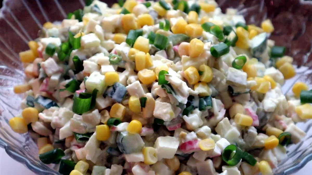 Сочетание сладкой кукурузы, пикантного лука, хрустящих овощей и нежного сыра под легкой заправкой создает гармоничный и освежающий вкус, который идеально подходит для легкого обеда или как дополнение к основному блюду.