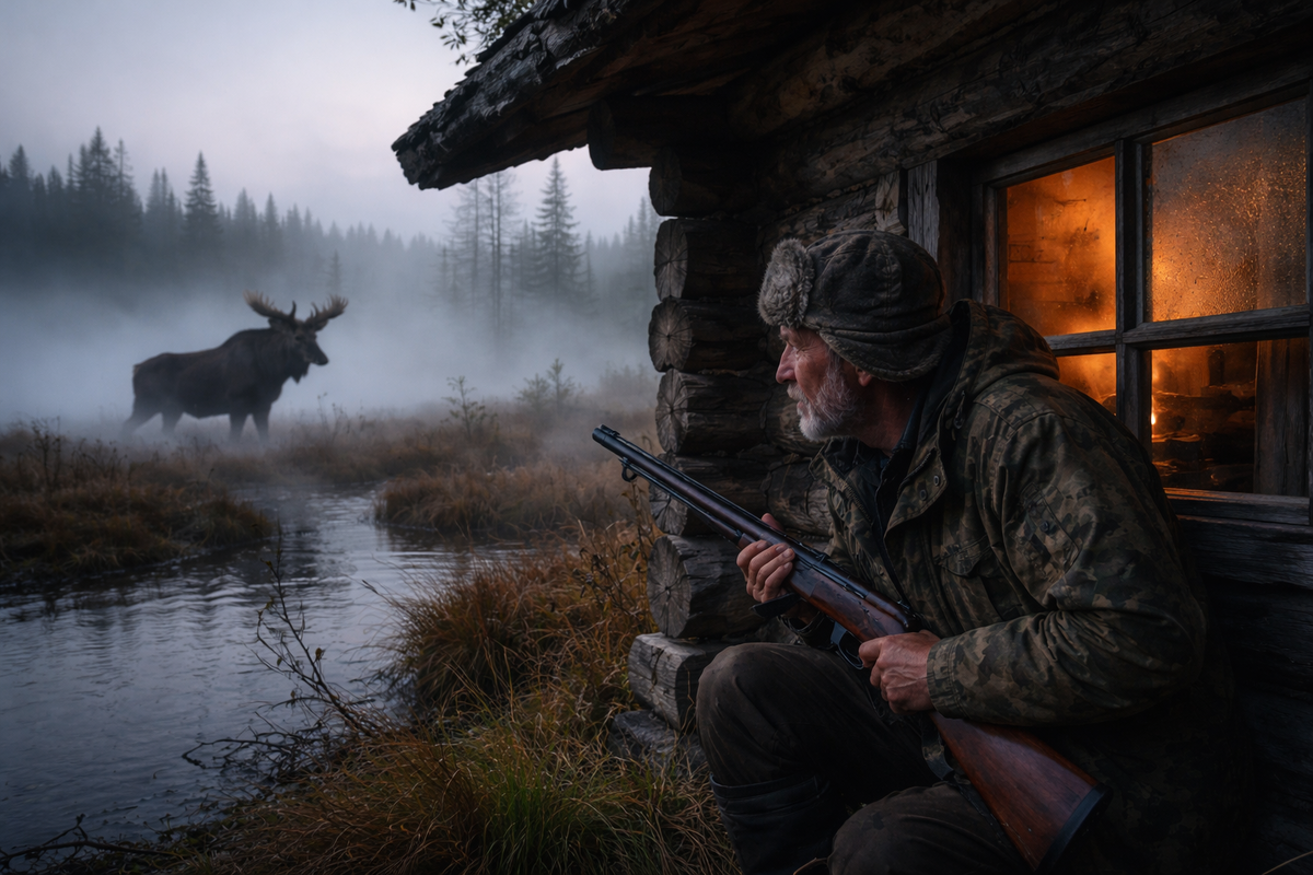 Матвей ставил эту избушку не от хорошей жизни, а от расчёта, который приходит только с годами — там, где другим кажется пусто и глухо, всегда есть зверь, просто не каждый умеет его читать, и болото это было как раз из таких мест: с виду вязкая, холодная пустота с редкими кочками и тёмной водой, но если присесть и посмотреть внимательно, то видно — жизнь там кипит, только тихая, скрытая, осторожная, и именно там он впервые увидел след, широкий, тяжёлый, глубокий, который не спутаешь ни с чем, и по тому, как он был продавлен, по тому, как разбита корка льда, Матвей сразу понял — ходит крупный лось, старый, сильный, не первый год в этих местах, а значит осторожный и не случайный, и уже тогда он решил, что задержится здесь дольше обычного, потому что такие встречи в тайге не бывают просто так, их надо заслужить терпением. Избушку он сложил быстро, не на совесть, а на время — из сухостоя, с низкой крышей, чтобы меньше тепла уходило, с маленьким оконцем, почти щелью, откуда можно было смотреть, не выдавая себя, и уже через пару дней он начал замечать закономерность: ночью, ближе к одному и тому же часу, со стороны болота начинался едва слышный треск, потом тишина, потом снова шаг, тяжёлый, уверенный, и так постепенно из темноты выходил он — тот самый лось, высокий, тёмный, с широкими рогами, которые в сумраке казались ещё больше, и он шёл не спеша, будто знал, что его никто не тронет, останавливался, прислушивался, потом продолжал идти к одному и тому же месту, где торчали сухие кусты и мох, и там кормился, не обращая внимания ни на избушку, ни на запах человека. Сначала Матвей просто наблюдал, как наблюдают за погодой или за огнём — спокойно, без лишних мыслей, но день за днём это стало чем-то другим, будто между ним и зверем возникла тонкая нитка, и каждый вечер превращался в ожидание, не охотничье, а почти личное, когда он сидел в полумраке, не шевелясь, и ждал, появится ли он снова, и когда тот выходил, сердце начинало биться иначе, не от азарта, а от какого-то странного напряжения, которое трудно объяснить словами. Он мог взять его уже на третью ночь — дистанция позволяла, ветер стоял правильно, всё складывалось, как надо, но рука не поднималась, потому что было ощущение, что если сделать выстрел сейчас, то закончится не только эта охота, а что-то большее, что происходит между ними, и Матвей сам не мог понять, что именно держит его, опытный человек, прошедший не одну зиму и видевший всякое, вдруг начал откладывать решение, которое раньше принял бы без раздумий. Так прошла неделя, потом вторая, и лось продолжал приходить, как по часам, иногда подходя ближе, иногда оставаясь на прежнем расстоянии, но всегда уверенно, без страха, и однажды ночью произошло то, чего Матвей не ожидал — зверь изменил маршрут и подошёл почти вплотную к избушке, остановился в нескольких шагах и замер, и в этой тишине стало слышно, как он дышит, как пар выходит из его ноздрей, как он медленно поворачивает голову, будто чувствует человека внутри, и в этот момент Матвей понял, что дальше отступать нельзя, потому что теперь это уже не просто наблюдение, это проверка, и если он сейчас ничего не сделает, то потом уже не сможет. Он медленно взял ружьё, не спеша, чтобы не скрипнула доска, не звякнул металл, и поднялся к окну, но когда он посмотрел на лося, тот стоял прямо перед ним, не убегал, не пугался, а просто 