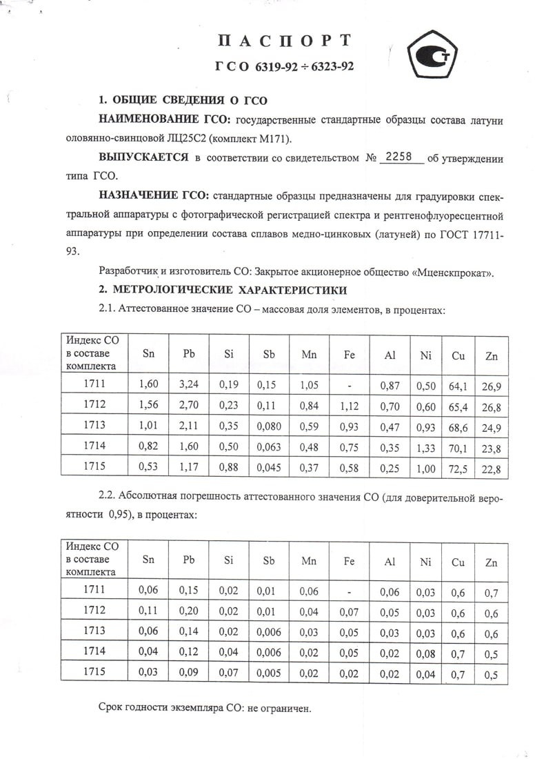 Именно для этого используется комплект государственных стандартных образцов латуней ГСО 6319-92 – 6323-92(образцы 1711–1715). В них аттестованы массовые доли целого набора элементов: Cu, Zn, Sn, Pb, Ni, Sb, Fe, Mn, Al, Si.