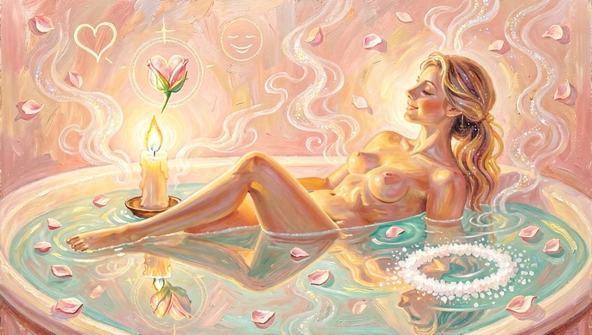 🌸 Зажги свечу с ароматом розы или иланг-иланга. Наполни ванну тёплой водой, добавь горсть соли и каплю любимого масла. Пока вода набирается, положи ладонь на сердце и скажи про себя: «Я принимаю себя. Я — это гармония». Пятница — день мягкой женской силы, когда пространство наполнено энергией принятия и нежности. Эта ванна смоет всё лишнее, а тёплый пар и ароматы помогут раскрыться, как бутону. Просто полежи, дыши глубоко и чувствуй, как любовь к себе разливается изнутри. Ты уже совершенна. 💖 Вытрись мягким полотенцем и улыбнись своему отражению. Завтра ты проснёшься более нежной и сияющей.