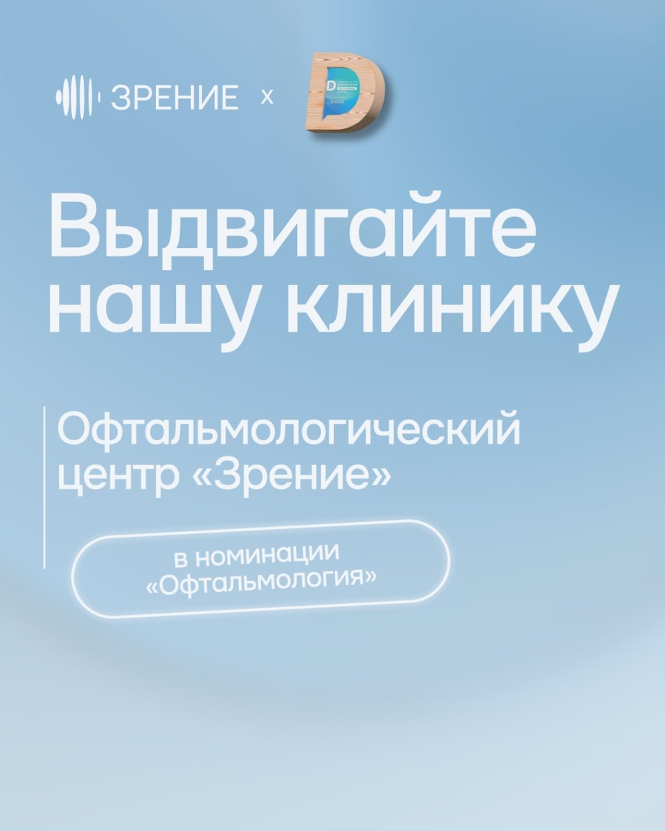 «Доктор Питер — частная медицина» 👀 Поддержите нас своим голосом в номинации «Офтальмология» https://priznanie.doctorpiter.ru/ Как оставить свой голос за нас: 1️⃣ Зайдите на страницу портала «Доктор Питер» 2️⃣ Сверху справа нажимаем на кнопочку «Назови своего номинанта» 3️⃣ Авторизуйтесь удобным для вас способом 4️⃣ В категории «Офтальмология» укажите наш офтальмологический центр «Зрение» (можете нажать и оно скопируется) 5️⃣ Нажмите кнопку «Отправить» Мы будем очень рады вашей поддержке! 💕