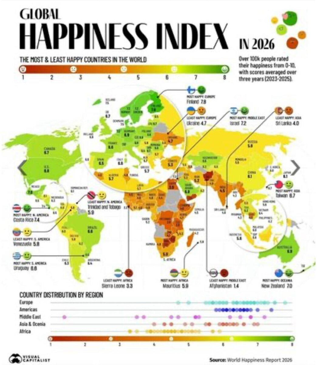 🌍 Опубликован ежегодный рейтинг стран по уровню счастья жителей — и вот главные итоги 👇