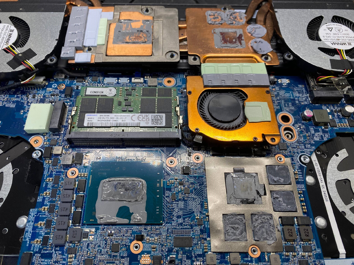 Ноутбук принесли к нам в сервис на плановую чистку системы охлаждения. И действительно, несмотря на то что не обслуживался он всего год, в процессе чистки мы видим, что термопаста внутри уже сухая. Поэтому мы и рекомендуем чистить игровые модели ноутбуков не реже, чем раз в год. В противном случае перегрев может привести к последующему дорогостоящему ремонту. Почистили, термоинтерфейс заменили – можно выдавать. С уважением, мастерская по ремонту компьютеров и ноутбуков «Ресурс Сервис», Санкт-Петербург.