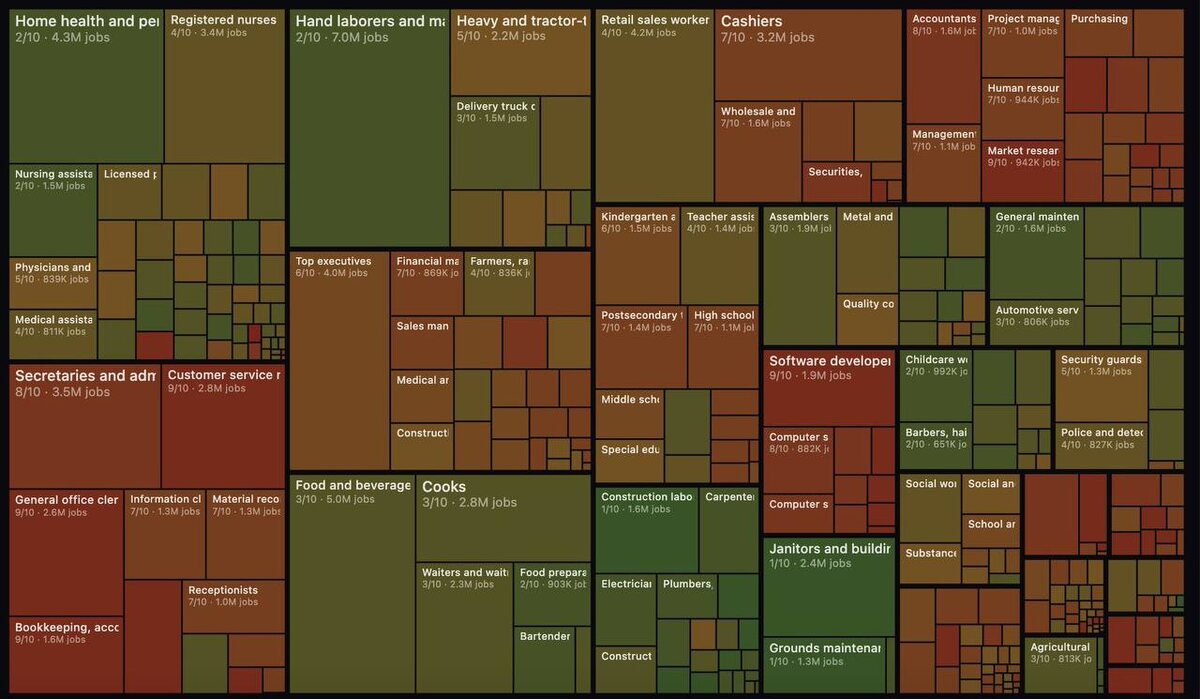 Коллеги, Andrej Karpathy — один из людей, стоявших у истоков OpenAI и бывший глава AI в Tesla — сделал довольно неприятную для многих вещь. Он оценил риск замещения ИИ для каждой профессии в США. Не на уровне рассуждений. Он взял 342 профессии из базы BLS, прогнал их через LLM по детальному рубрикатору и построил карту риска автоматизации. Получилась очень простая шкала от 0 до 10. И результаты выглядят… мягко говоря, неудобно. 0–1 — почти безопасно кровельщики, уборщики, физический труд 4–5 — средний риск медсёстры, врачи, ритейл 8–9 — высокий риск разработчики, паралигалы, аналитики данных 10/10 — практически гарантированная автоматизация медицинские транскрипционисты Средний балл по всем профессиям: 5.3 То есть половина рынка труда уже находится выше середины шкалы риска. Но самое интересное — общий паттерн. Профессии с низким риском имеют одну общую черту: они требуют физического присутствия человека. Профессии с высоким риском имеют другую: их результат — цифровой фай