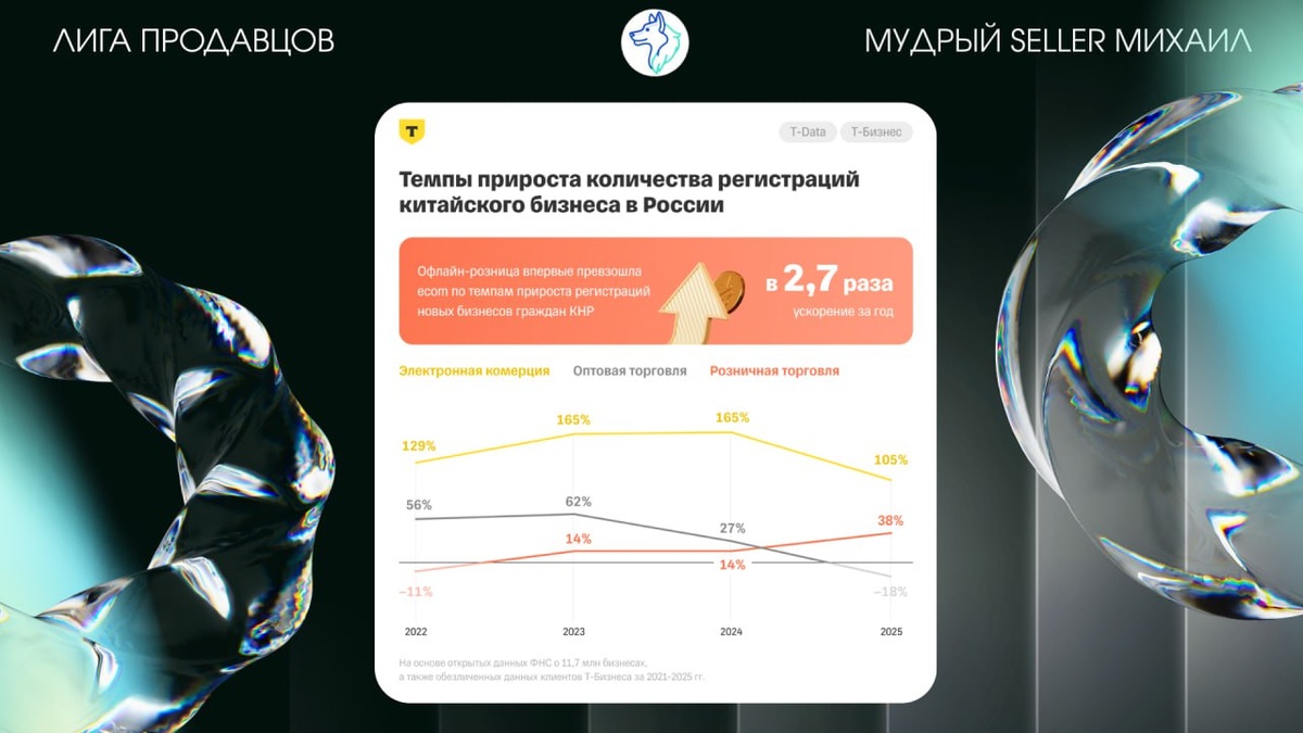 ‼️ По данным исследования Т-Бизнеса, число китайских компаний в российском e-com за 2025 год выросло в 2,4 раза. Теперь каждое пятое ООО в сфере онлайн-торговли регистрирует предприниматель из КНР. ➡️ Больше половины всех регистраций приходится именно на электронную коммерцию. Мебель, электроника, осветительные приборы, продукты питания — направления, в которых китайские продавцы работают особенно активно. 🔔Просто перепродавать товар с условного 1688 — стратегия, у которой срок годности стремительно истекает. Пора думать шире: уникальные комплекты, локализация, скорость доставки, качество карточек. Всё то, где мы на своём поле можем быть сильнее. ⬇️Как ощущаете на себе рост китайских продавцов? Демпингуют в вашей нише? Делитесь в комментариях 📱 ПОДПИСАТЬСЯ в Telegram 📱 Подписаться ВК Консультация Мудрого|Юнитка Ozon|Закрытый-чат продавцов