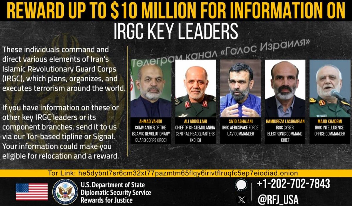 ⚡️США предлагают награду до $10 млн за информацию о пяти высокопоставленных иранских чиновниках