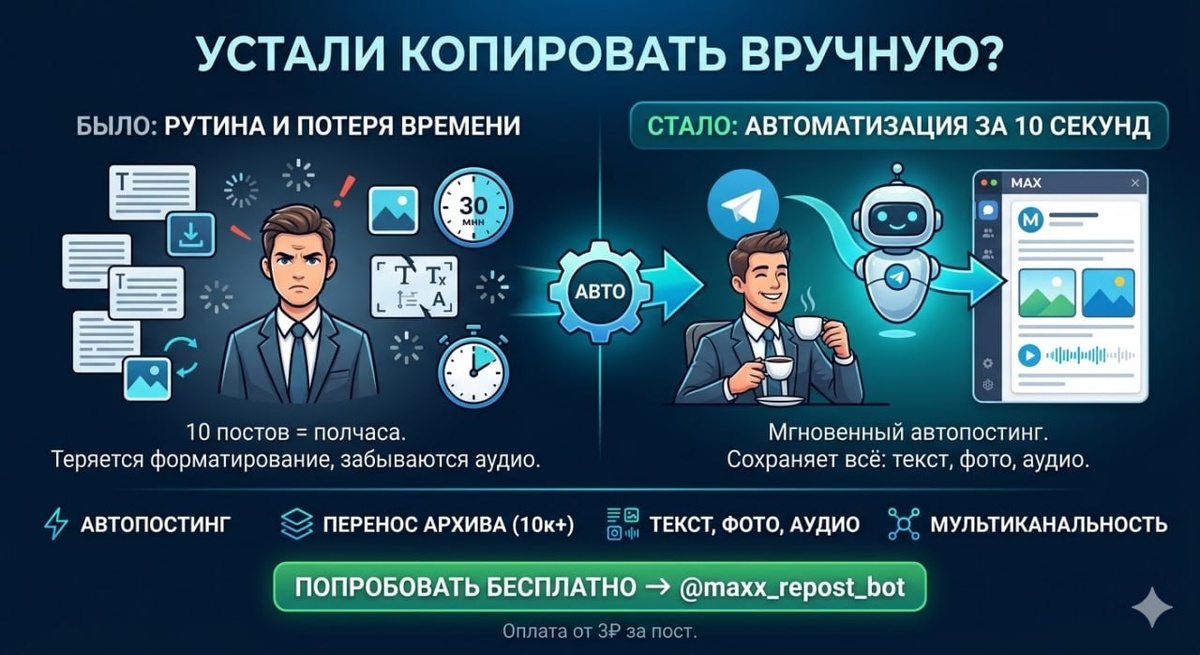?💜 Каждый день одно и то же скопировал текст, скачал фото, загрузил в Max, забыл про аудио, потерял форматирование. На 10 постов уходит полчаса. А если каналов несколько весь день на это. @maxx_repost_bot решает это за тебя. Подключаешь свой TG-канал → указываешь чат в Max → бот переносит всё сам. Текст, фото, аудиозаписи — автоматически, через 10 секунд после публикации. Что умеет: → Автопостинг — новые посты летят в Max мгновенно → Перенос архива — хоть 10, хоть 10 000 старых постов → Аудио и фото — скачивает, загружает, удаляет за собой → Несколько каналов — каждый в свой чат Max Оплата от 3₽ за пост. Первые переносы — бесплатно. Попробовать → @maxx_repost_bot 🔴ИНСТРУКЦИЯ🟠