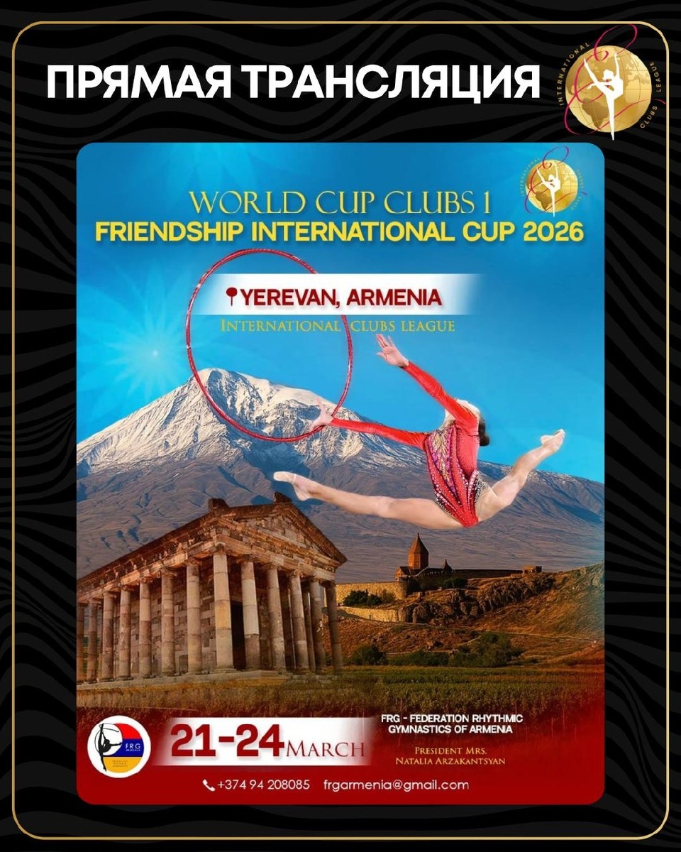 🌍✨ Уже завтра, с 21 по 24 марта 2026 года, в Армении🇦🇲, в городе Ереван, стартует международный турнир World Cup Clubs 1 – Friendship International Cup, который проходит в рамках Международной Клубной Лиги. 📍Место проведения: ул. Царав Ахпюр, 55/25, Ереван 🌍В соревнованиях примут участие около 1800 спортсменок и представители более чем из 5 стран, что делает турнир одним из самых масштабных стартов сезона. 🏆Участниц ждут: — международная конкуренция высокого уровня — начисление рейтинговых очков Международной Клубной Лиги — борьба за позиции в международном рейтинге 🎥Уже завтра будет доступна прямая трансляция соревнований в нашем Telegram-канале 🔗https://dzen.ru/id/64ae7053af2b17677270b0fb 📄Подробности и положение — на сайте: https://rgclubsleague.com/schedule/world-cup-clubs-1-friendship-international-cup-2026/ Следите за новостями — впереди четыре дня большого международного турнира! The International Club League starts tomorrow — World Cup Clubs 1 – Friendship Inter