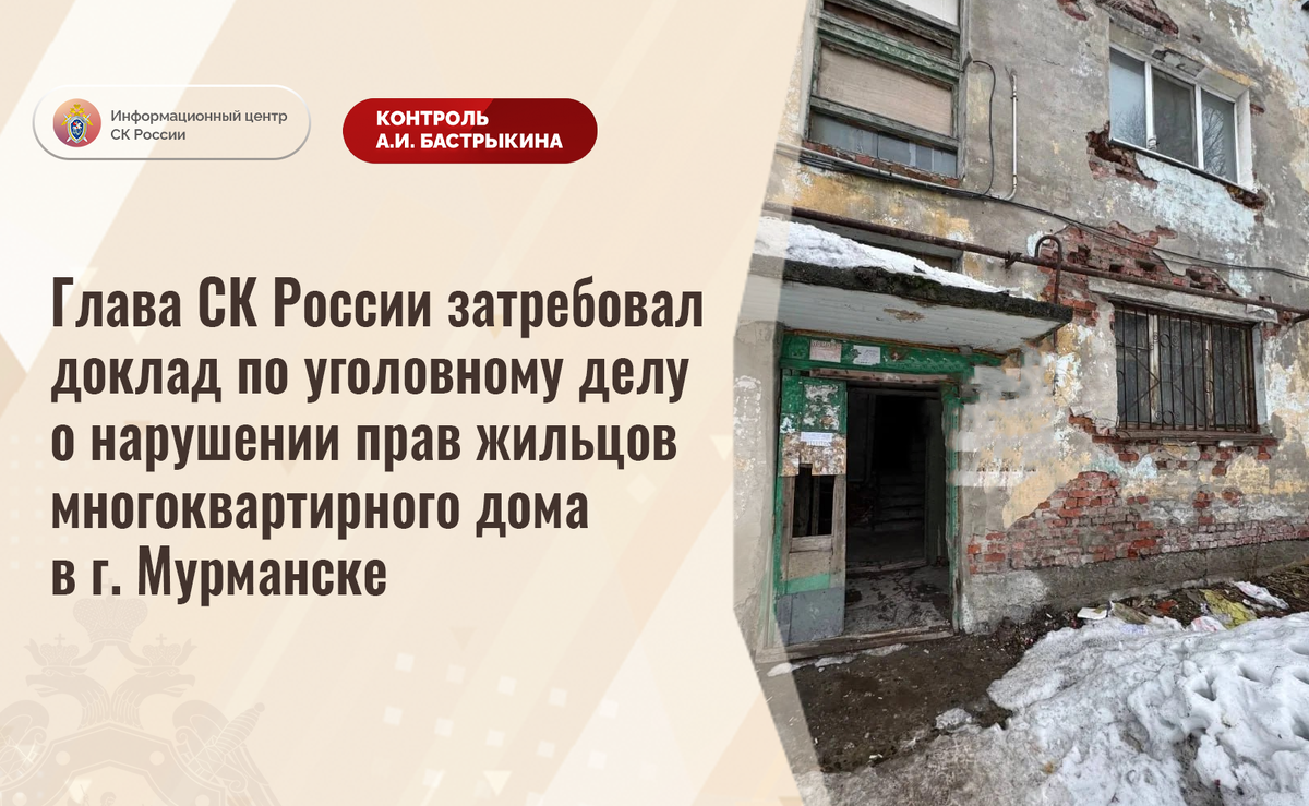Глава СК России затребовал доклад по уголовному делу о нарушении прав жильцов многоквартирного дома в г. Мурманске В социальной сети сообщается о нарушении прав жильцов многоквартирного дома на улице Свердлова в городе Мурманске. На протяжении длительного времени здание 1962 года постройки находится в непригодном состоянии: стены разрушаются, в подъездах отсутствуют стеклопакеты и двери, кровля протекает, из-за чего помещения затапливаются. Несмотря на имеющиеся нарушения, мер к проведению ремонта не принимается. Обращения граждан в различные инстанции результатов не принесли. В СУ СК России по Мурманской области расследуется уголовное дело, по которому ранее А.И. Бастрыкин поручал представить доклад. Председатель Следственного комитета Российской Федерации Александр Иванович Бастрыкин затребовал у руководителя СУ СК России по Мурманской области Андрея Александровича Ефремова доклад о проведенном по уголовному делу комплексе следственных действий и установленных обстоятельствах. Испол