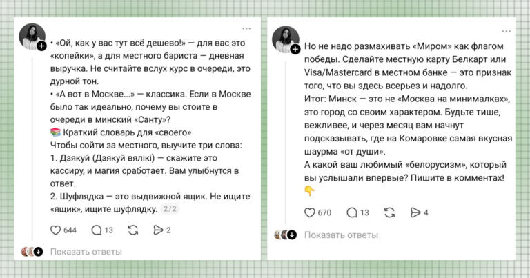 В последнее время москвичи вспомнили о таком чудесном и доступном направлении, как Минск. Туда и раньше ездили на шопинг в Zara и не только, но теперь выяснилось, что там еще и интернет в центре ловит. Многие задумались о переезде. В приложении Threads стратегию уже обсуждают как рабочий сценарий. Пользователи пишут: «Поделитесь, как у вас обстановка с интернетом и соцсетями? Я уже подумываю переезжать из Москоу в Минск», «Я, наверное, буду планировать переезд в Белоруссию. Очень надоело жить в цифровом вакууме». Последний комментатор, впрочем, уже провалил вступительный экзамен: слово «Белоруссия» — это сразу минус балл. Именно с таких деталей и начинается тот самый список «для понаехавших», который минчане сейчас распространяют по соцсетям без особого восторга от новых гостей. Курс успешной адаптации помимо обязательного перехода на Беларусь начинается с отказа от базовых московских конструкций: «А вот в Москве… », «Минск — это Москва на минималках» и т. д. Удивляться вслух тому, «ка