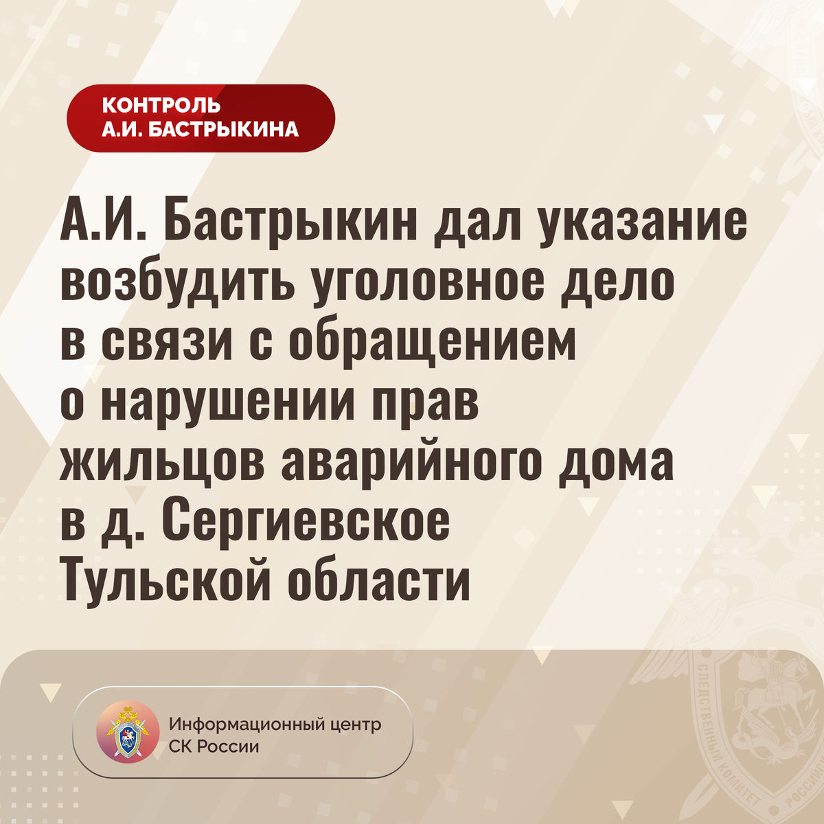 А.И. Бастрыкин дал указание возбудить уголовное дело в связи с обращением о нарушении прав жильцов аварийного дома в д. Сергиевское Тульской области В приемную Председателя СК России А.И. Бастрыкина в социальной сети «ВКонтакте» обратился житель Тульской области по вопросу нарушения прав его семьи, воспитывающей двоих детей, один из которых является инвалидом, при переселении из многоквартирного дома на улице Молодежной в деревне Сергиевское. Длительное время здание 1963 года постройки находится в непригодном состоянии: водоснабжение отсутствует, кровля повреждена, перекрытия разрушатся, в стенах образовались трещины. В 2022 году ввиду высокой степени физического износа конструкций строение признано аварийным, однако в установленные на начало 2025 года сроки расселения гражданам благоустроенное жилье не предоставлено. Обращения в компетентные органы результатов не принесли. В СУ СК России по Тульской области организована процессуальная проверка. Председатель Следственного комитета Ро
