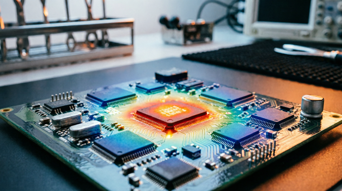 Главные вызовы при работе с тепловизорами — разная излучательная способность (эмиссивность) материалов на плате и ограничение разрешения оптики.