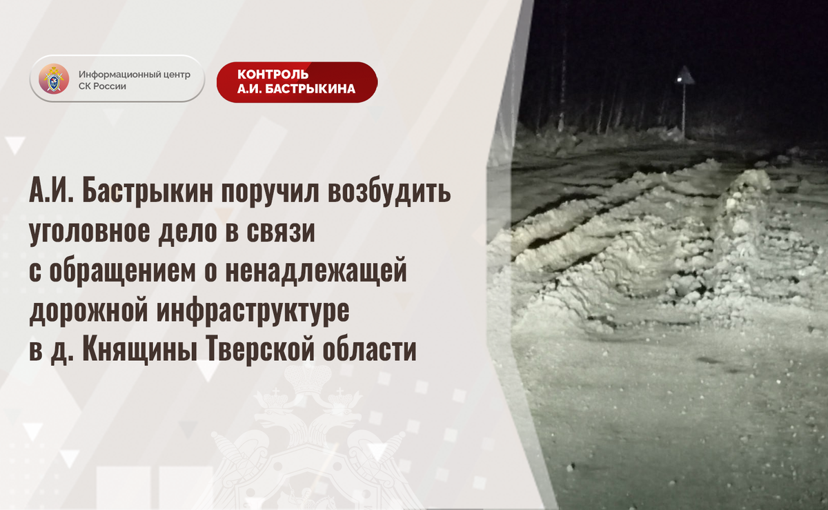 А.И. Бастрыкин поручил возбудить уголовное дело в связи с обращением о ненадлежащей дорожной инфраструктуре в д. Княщины Тверской области К Председателю СК России А.И. Бастрыкину через Информационный центр поступило обращение по вопросу нарушения прав жителей деревни Княщины Тверской области на качественную дорожную инфраструктуру. Длительное время автомобильная дорога, ведущая в населенный пункт, находится в непригодном состоянии: асфальтовое покрытие отсутствует, из-за регулярного проезда крупногабаритного транспорта на грунтовом полотне образовались многочисленные ямы и колеи, из-за чего проезд по ней автомобилей затруднен. Несмотря на имеющиеся нарушения, мер к организации ремонтных работ не принимается. В СУ СК России по Тверской области организована процессуальная проверка. Председатель Следственного комитета Российской Федерации Александр Иванович Бастрыкин поручил и.о. руководителя СУ СК России по Тверской области Александру Викторовичу Федорову возбудить уголовное дело и доло