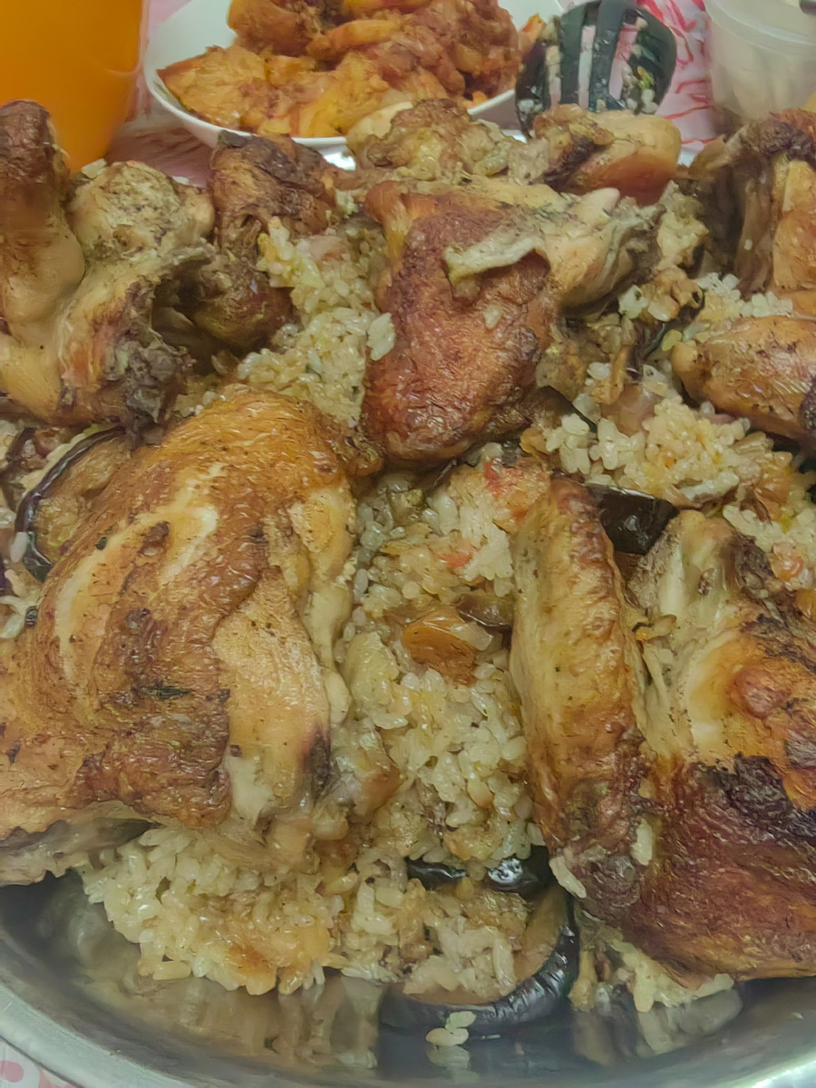 Гхада принесла с собой плов с баклажанами и курицей. А мой муж по такому случаю достал из морозилки копченую селёдку.