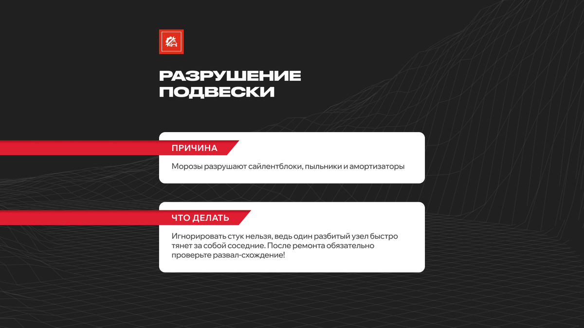 Если ваш автомобиль благополучно пережил морозы, это еще не значит, что он вышел из зимы без потерь. Часто неисправности просто маскируются: звуки приглушаются сугробами, а утечки замерзают. Разберем топ-5 поломок, которые обычно всплывают весной и которые нельзя игнорировать. Весной жалобы на ходовую часть возглавляют список обращений на ремонт машин. Зимой многие водители интуитивно ездят медленнее, а снежный покров на дорогах работает как дополнительная шумоизоляция, скрывая побрякивания и люфты. Но как только асфальт очищается от льда, скрытые проблемы становятся очевидными. Основной удар принимают на себя резинометаллические изделия. Резкие перепады температур заставляют сайлентблоки, пыльники и втулки стабилизатора то сжиматься, то расширяться. К марту резина теряет эластичность, трескается и рвется. В эти трещины попадает агрессивная дорожная химия, превращая деталь в труху. Чаще всего под замену идут амортизаторы, шаровые опоры и сайлентблоки рычагов. Помните, что замена этих у