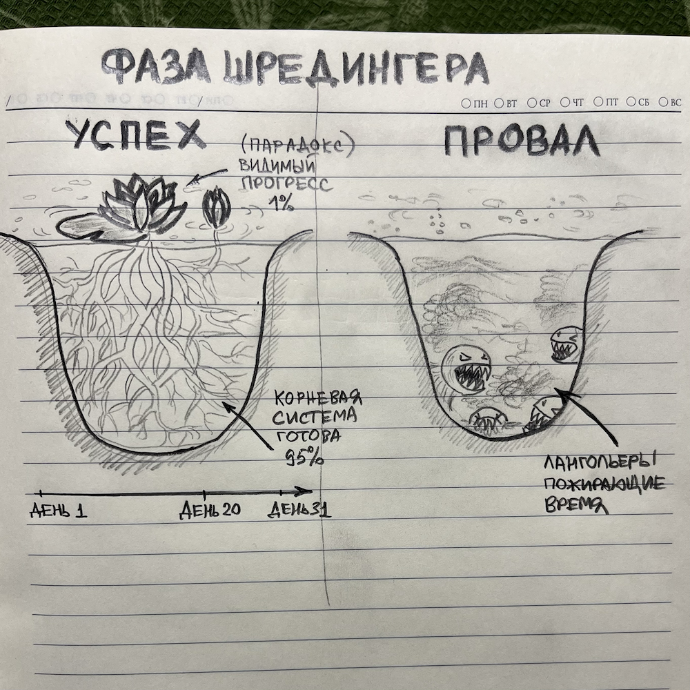 ⏳ Осталось 11 дней. В феврале я выкладывал пост со старой математической загадкой. Представьте пруд, в котором растет кувшинка. Каждый день площадь, которую она занимает удваивается. Ровно за 30 дней она полностью закроет пруд. Вопрос: На какой день она закроет половину пруда? Большинство ищут интуитивно ответ в середине срока, но правильный ответ - на 29 день. Это значит, что на 20-й день пруд кажется пустым. На 25-й день закрыты лишь крошечные участки. Весь масштаб изменений мы видим только в последние 48 часов. Мы часто бросаем именно на 20-й день. Нам кажется, что ничего не происходит. Но это иллюзия. Прямо сейчас, под водой, строится мощная корневая система. Она не видна глазу, но без нее не будет того взрывного роста на 30-й день. С 1 января я прогонял через себя порядка 40 привычек. Выбрасывал лишнее, проектировал систему, оптимизировал нужное. С 1 марта я перешел в фазу проверки на прочность: 31 день дисциплины, написания статей, ежедневных отчетов и графических скетчей. Это не