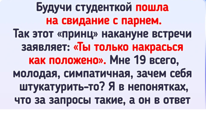 - Будучи студенткой пошла на свидание с парнем. Так этот «принц» накануне встречи заявляет: «Ты только накрасься как положено». Мне 19 всего, молодая, симпатичная, зачем себя штукатурить-то? Я в непонятках, что за запросы такие, а он в ответ: «Мне папа сказал, если девушка идет на свидание, то она обязательно должна быть накрашена и выглядеть идеально».